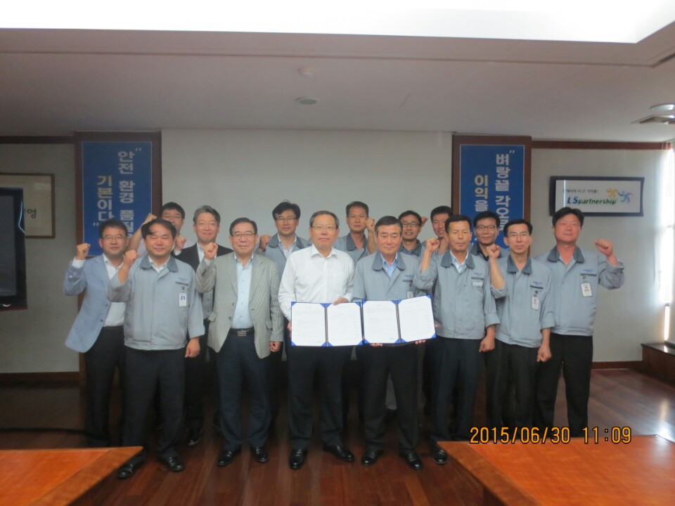가온전선(주)와 가온전선 노동조합은 2015년 임금 및 단체협약 갱신 과정에서 대내외적으로 어려운 경영환경과 그에 따른 경영위기에 공감하고, 지속적인 경영혁신과 품질, 납기, 생산성 향상에 최선의 노력을 다할 것을 다짐하면서 2015년 임단협 조인식을 가졌습니다.