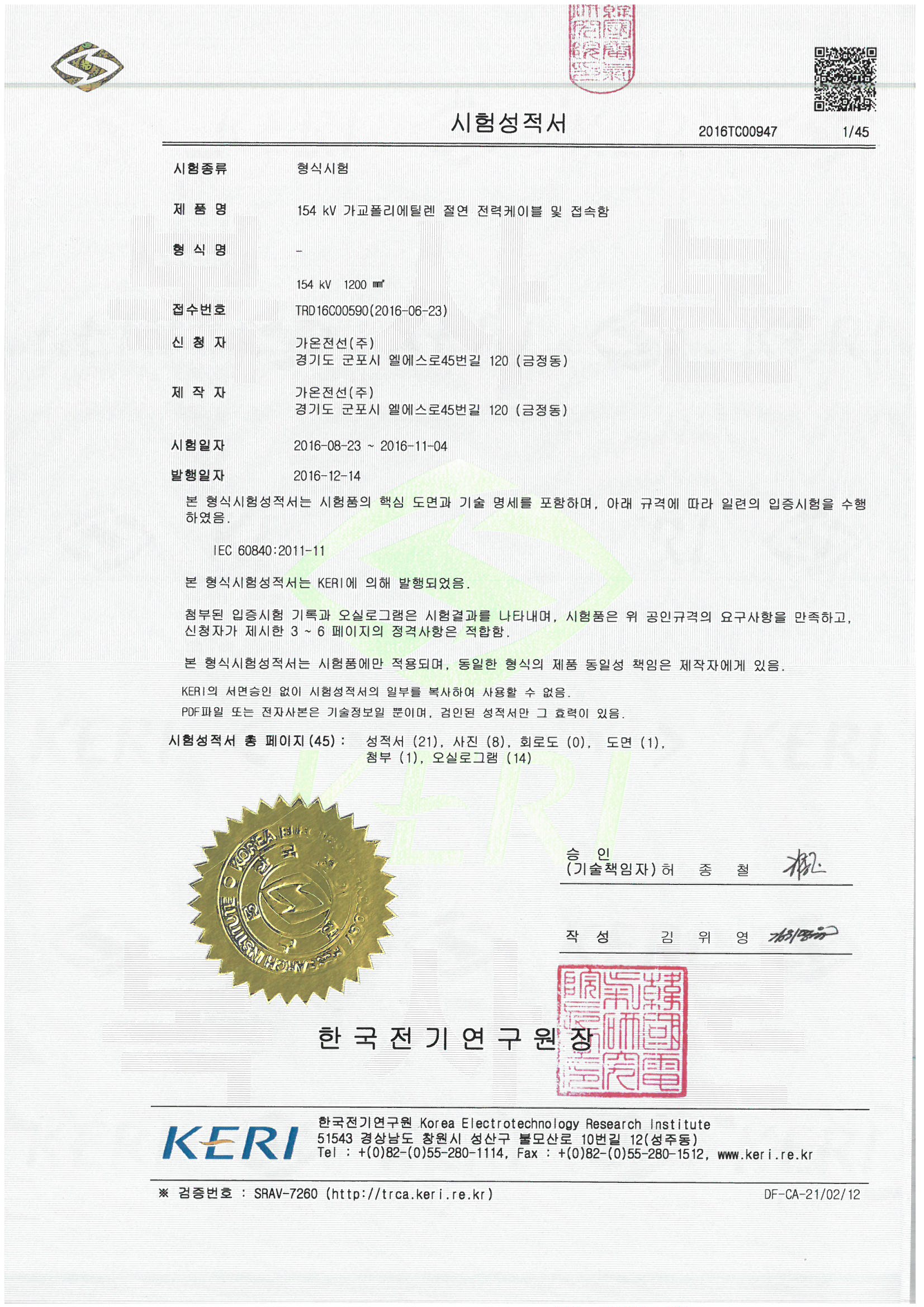 초고압 케이블 KERI Test Report 취득 현황은 아래와 같습니다.