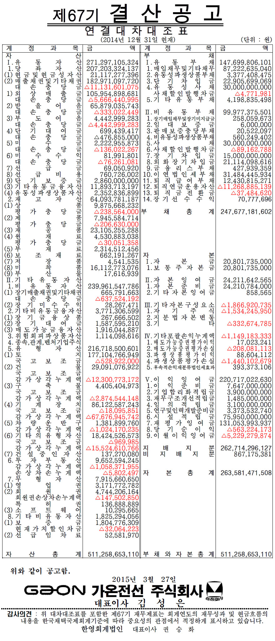 제67기 연결 결산공고 (2014년 12월 31일 현재)